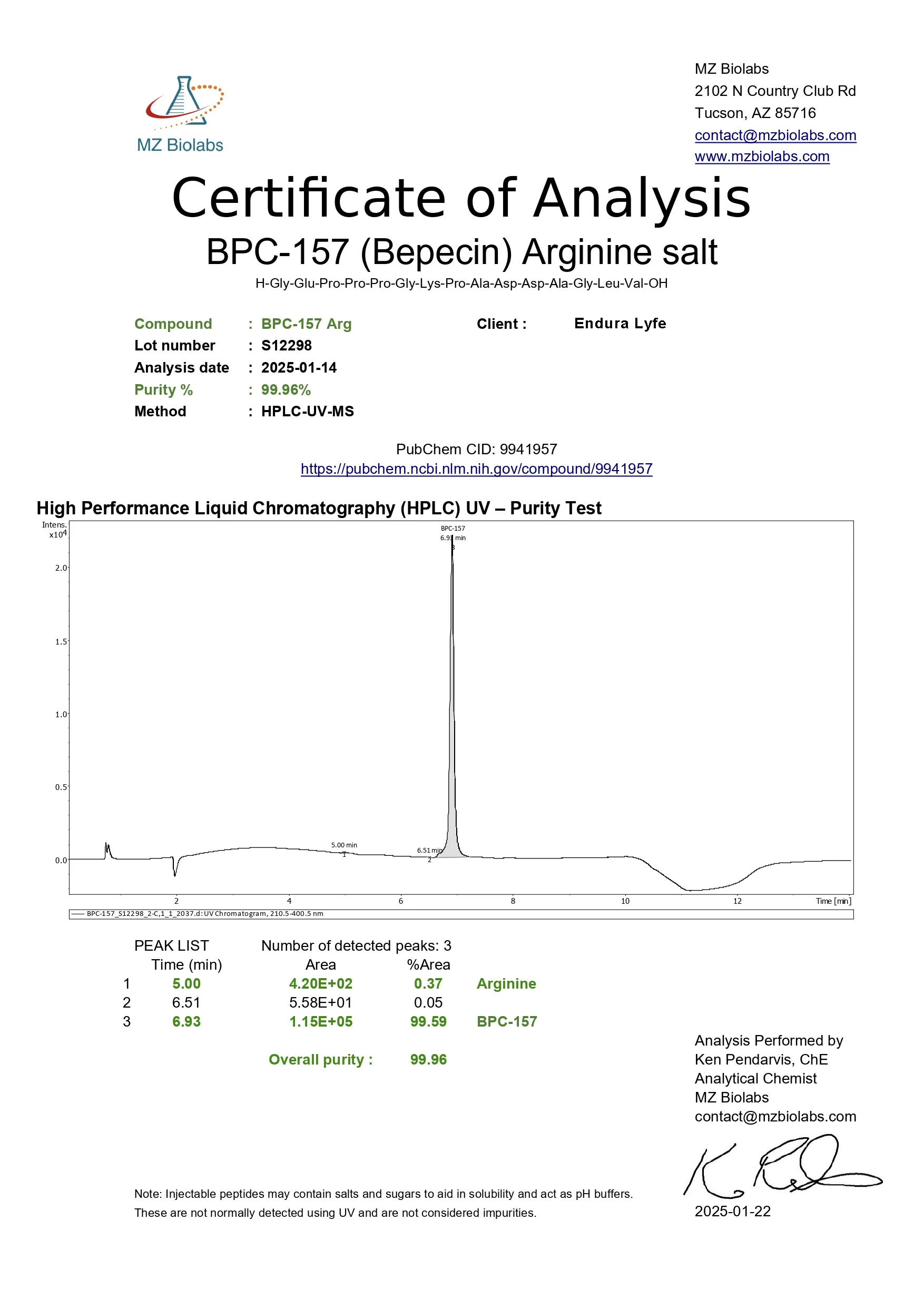 BPC-157 is a highly stable synthetic pentadecapeptide, originally isolated from human gastric juice, that has emerged as a cornerstone in regenerative medicine research. Extensively studied for its profound healing and tissue-regenerative properties, BPC-157 is investigated for its potential to accelerate the recovery of muscles, tendons, ligaments, and joints, as well as support gastrointestinal health. Scientific literature suggests that BPC-157 enhances angiogenesis (formation of new blood vessels), modulates inflammatory responses, and may protect against oxidative stress, making it a versatile peptide for multiple research applications. Endura Lyfe offers BPC-157 with verified ≥98% purity, backed by third-party analysis for consistent research outcomes. Researchers worldwide rely on BPC-157 to investigate pathways involved in wound healing, tissue regeneration, and gastrointestinal protection, contributing to advancements in sports medicine, orthopedics, and gastroenterology.