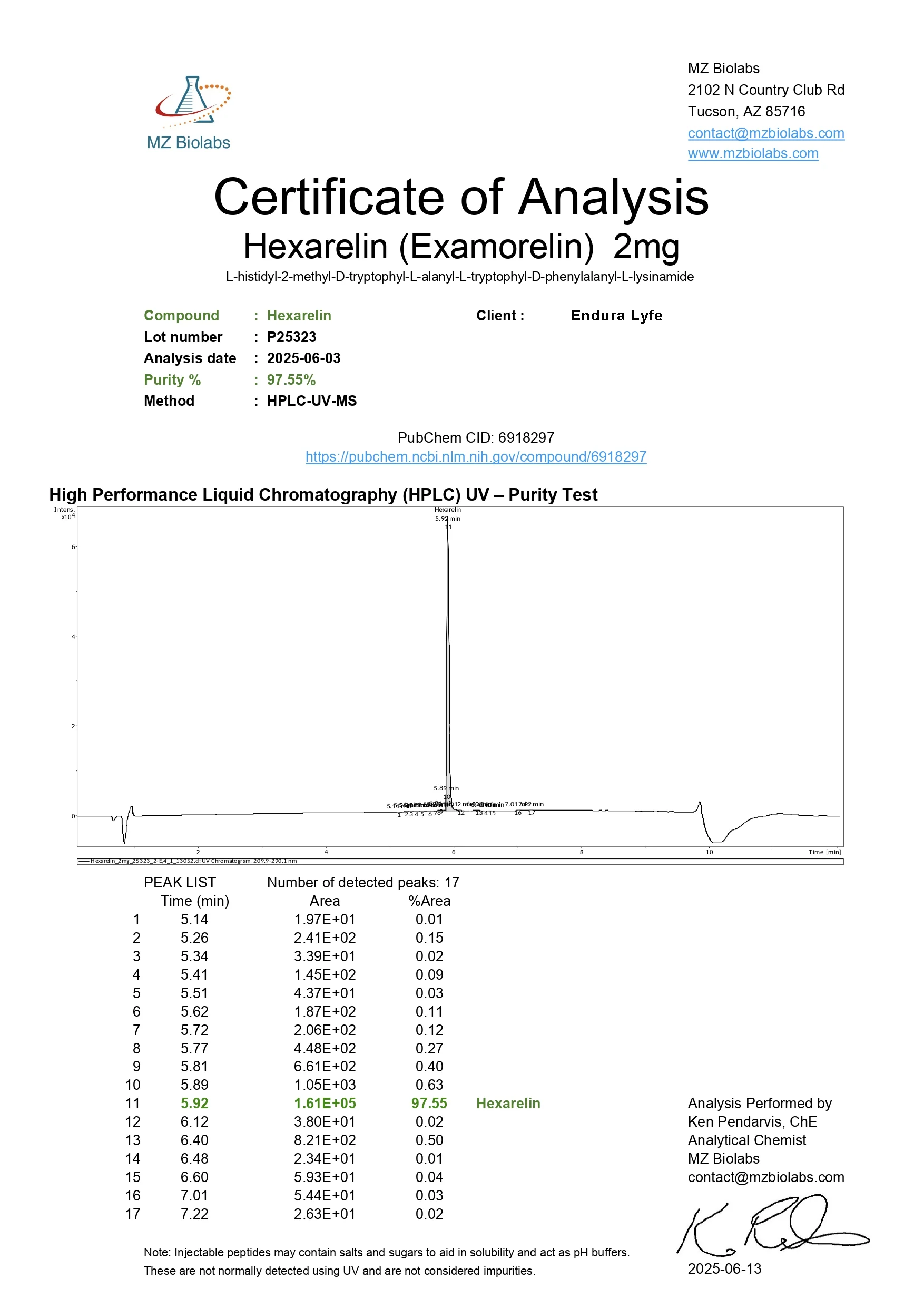 Hexarelin is a synthetic growth hormone secretagogue and potent peptide agonist of the ghrelin receptor, widely investigated for its effects on muscle growth, cardiac health, and recovery from injury. In laboratory research, Hexarelin has been shown to significantly stimulate endogenous growth hormone secretion, promoting anabolic effects on muscle and connective tissues while also displaying cardioprotective benefits. Researchers value Hexarelin for its unique ability to support tissue repair, enhance muscle strength, and potentially aid in post-injury rehabilitation. Endura Lyfe supplies Hexarelin at ≥98% purity, supported by third-party laboratory testing to ensure reliability and reproducibility in experimental studies. Hexarelin is an essential asset in the exploration of peptide-based approaches to muscle growth, cardiac protection, and regenerative medicine.